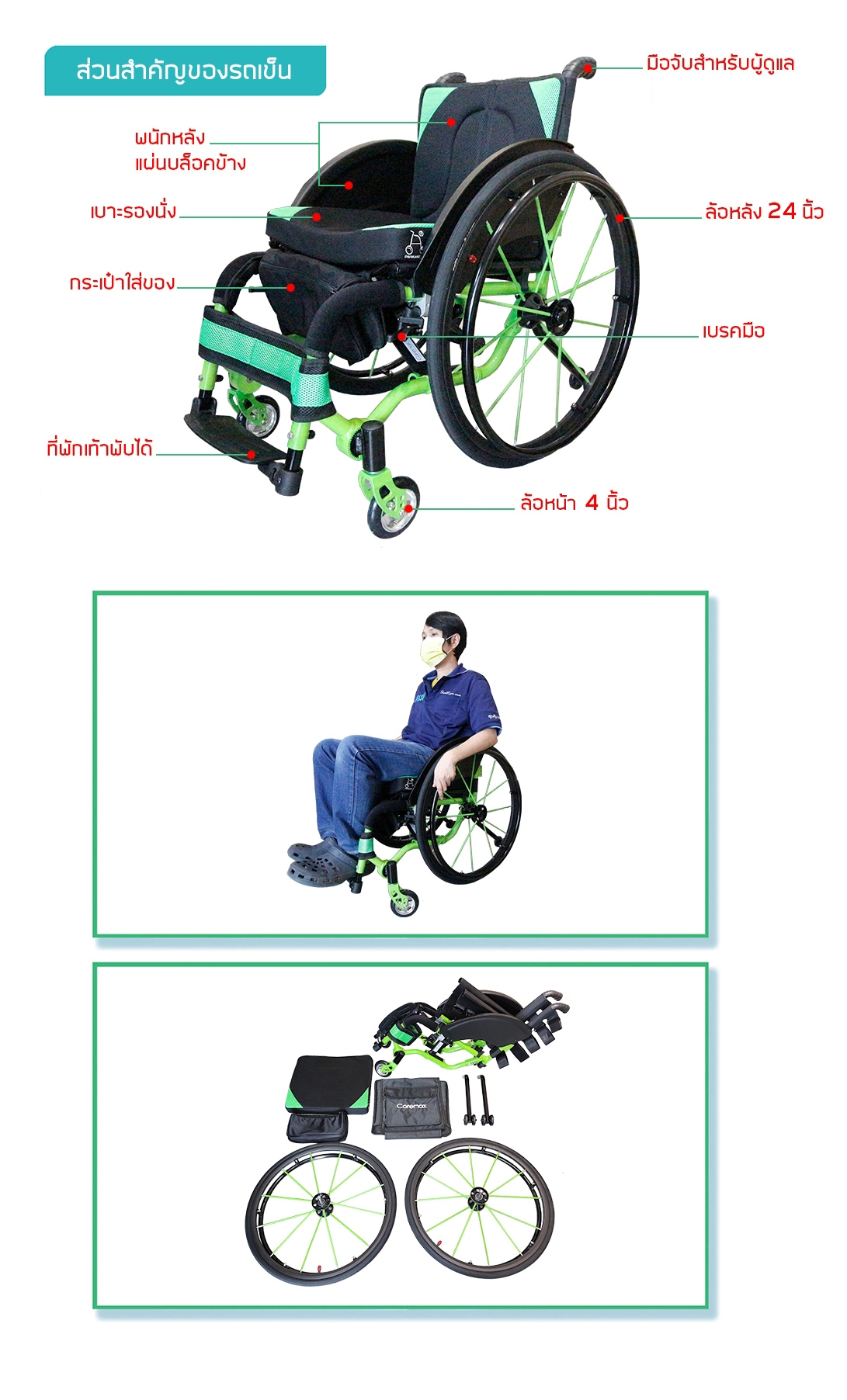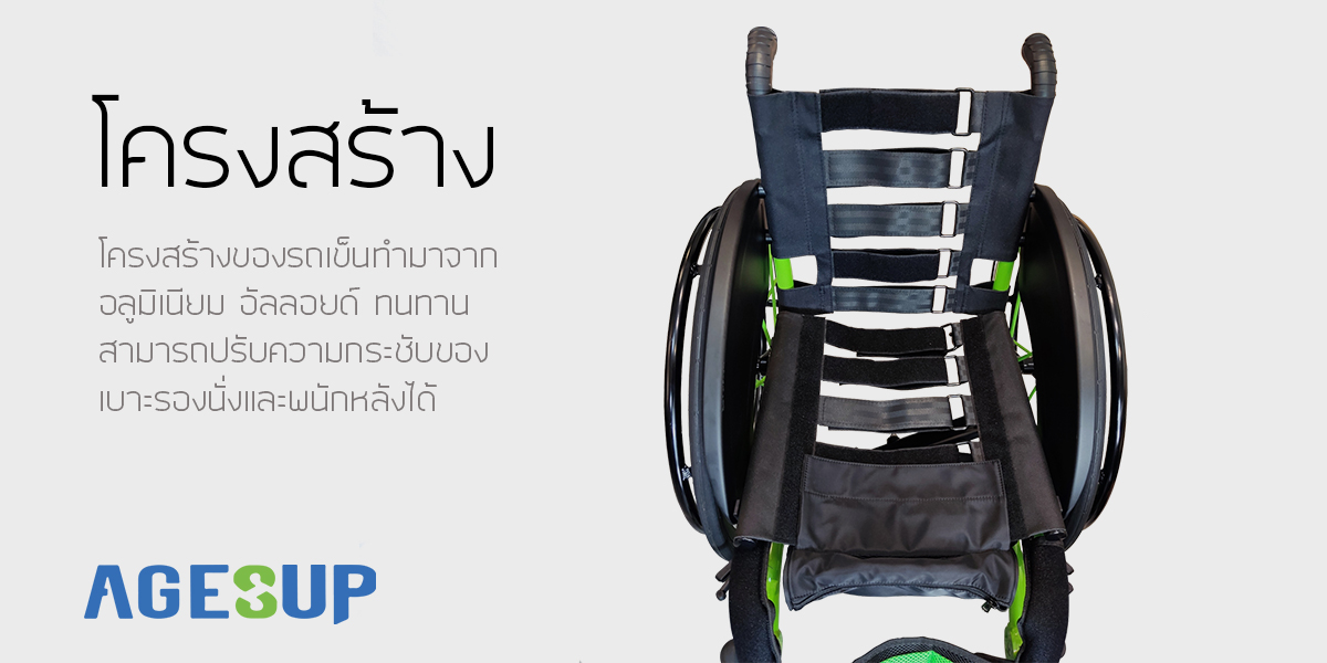 โครงสร้างของรถเข็นทำมาจากอลูมิเนียม อัลลอยด์ ทนทานสามารถปรับความกระชับของเบาะรองนั่งและพนักหลังได้
