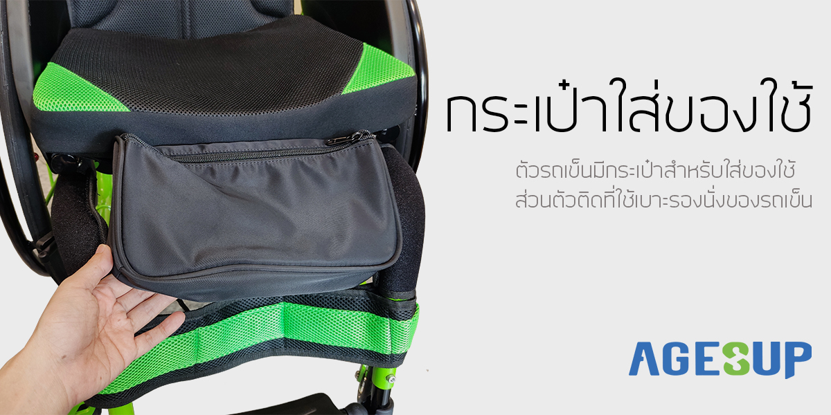 กระเป๋าใส่ของใช้ ตัวรถเข็นมีกระเป๋าสำหรับใส่ของใช้ส่วนตัวติดที่ใช้เบาะรองนั่งของรถเข็น