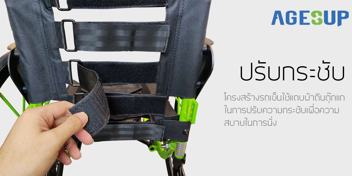 ปรับกระชับโครงสร้างรถเข็นใช้แถบผ้าตีนตุ๊กในการปรับความกระชับ เพื่อความสบายในการนั่ง