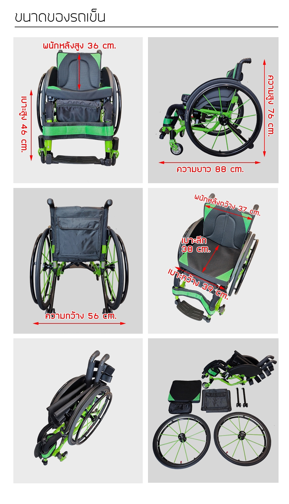 ความกว้างของตัวรถเข็น 31 เซนติเมตร (เมื่อพับรถเข็น) 56 เซนติเมตร (เมื่อกางออก)